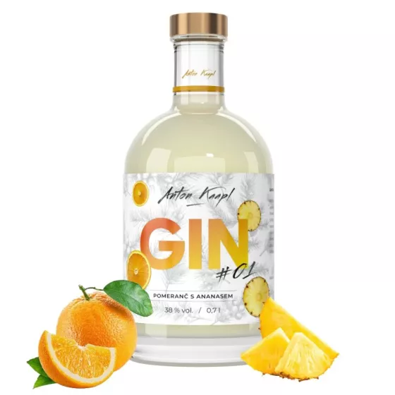 Anton Kaapl Gin #1 pomeranč s ananasem 38% Spojení svěžího pomeranče a tropického ananasu přináší harmonii citrusové lehkosti a jemné ovocné sladkosti. Vyroben průtahovou destilací macerátu z pomerančů s přidáním ananasu, jalovce, koriandru a bylin. Přírodní mléčný zákal je znakem nefiltrovaného charakteru a plné chuti. Země původu: Česká republika