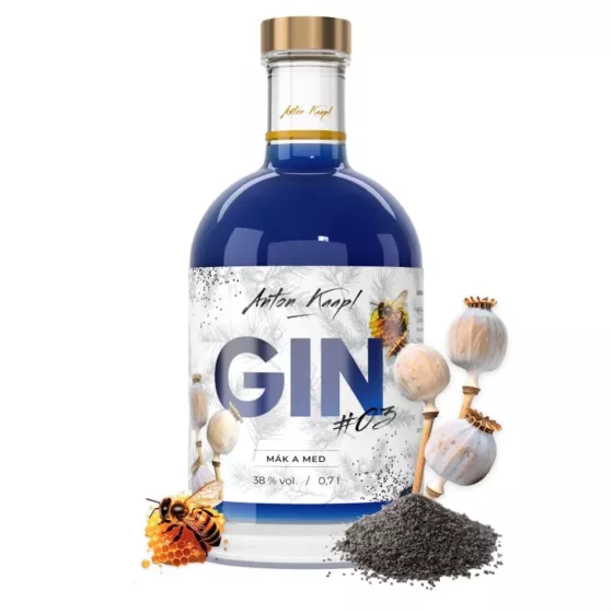 Anton Kaapl Gin #3 mák a med 38% Gin s dominantní chutí českého máku a jemnými tóny medu. Díky květu Klitorie ternatské získává přirozený tmavě modrý odstín a v koktejlech mění barvu do fialova. Vyroben průtahovou destilací macerátu z máku, jablkovice s medem, jalovce, koriandru a bylin. Přirozený zákal je důkazem nefiltrovaného charakteru cloudy ginů. Země původu: Česká republika