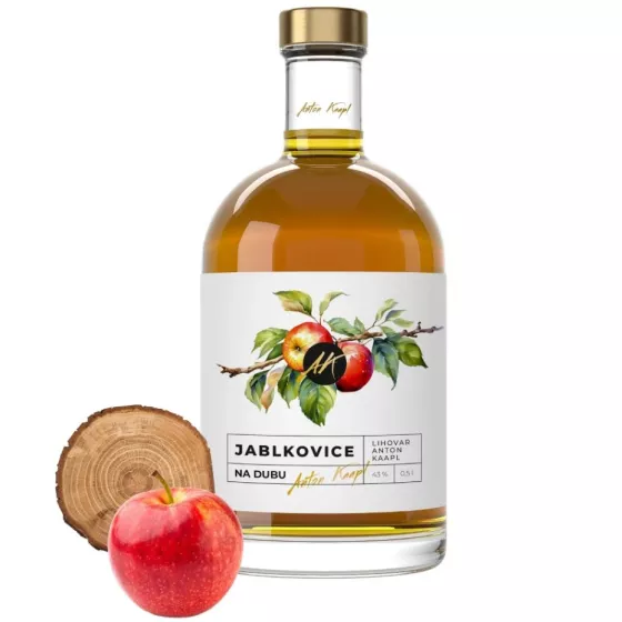 Anton Kaapl Jablkovice na dubu 43% Tento destilát vznikl kvašením a destilací pečlivě vybraných jablek. Následně zrál na francouzském dubu, který mu dodal jemnost a charakter. Naředěn je měkkou demineralizovanou vodou z 102 metrů hlubokého vrtu v klikovském souvrství Třeboňské pánve. Země původu: Česká republika